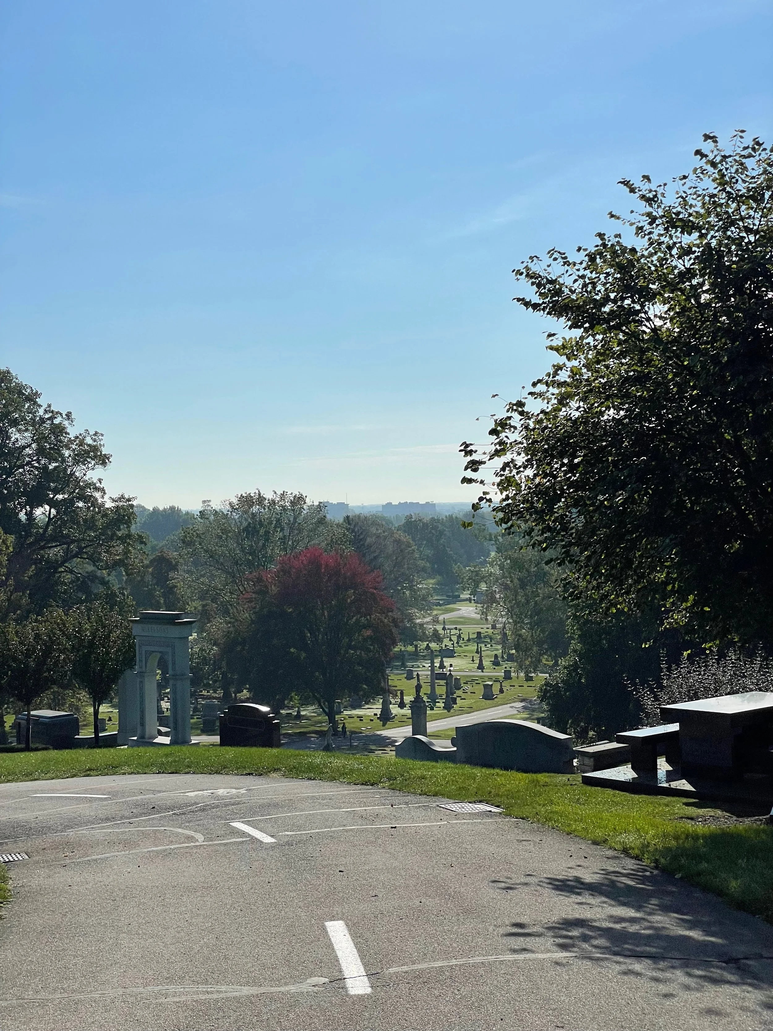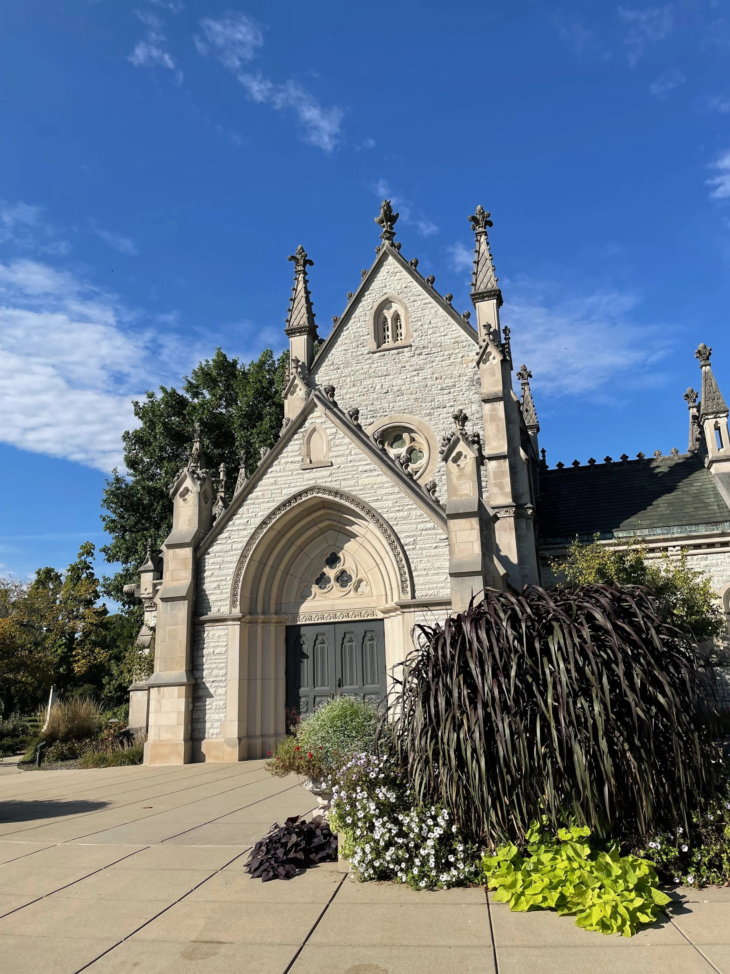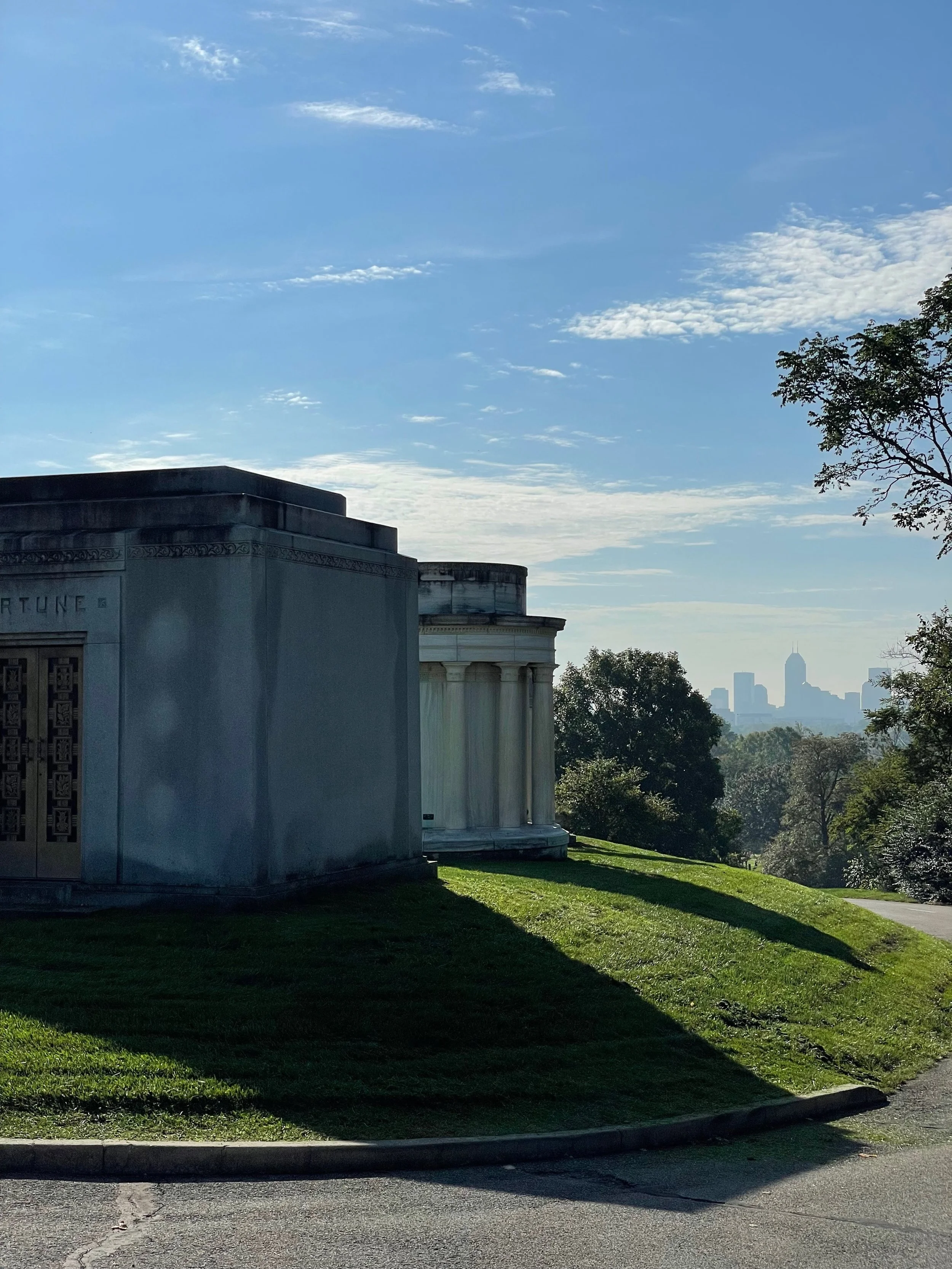 After the Holcomb gardens, we took a short nap break for our youngest and then ventured over to the Crown Hill Cemetery. Cemeteries aren’t typically on our radar of places to visit in a new city, but the Crown Hill Cemetery is one of the largest in the U.S., is the resting place for many notable people, and offers views of the downtown skyline. The cemetery was first established in 1863 and became a national cemetery a few decades later. It houses Benjamin Harrison and several vice presidents, along with poets, criminals, political activists, inventors, and so on. It also houses thousands of trees, several sculptures, wildlife, and unique mausoleums.