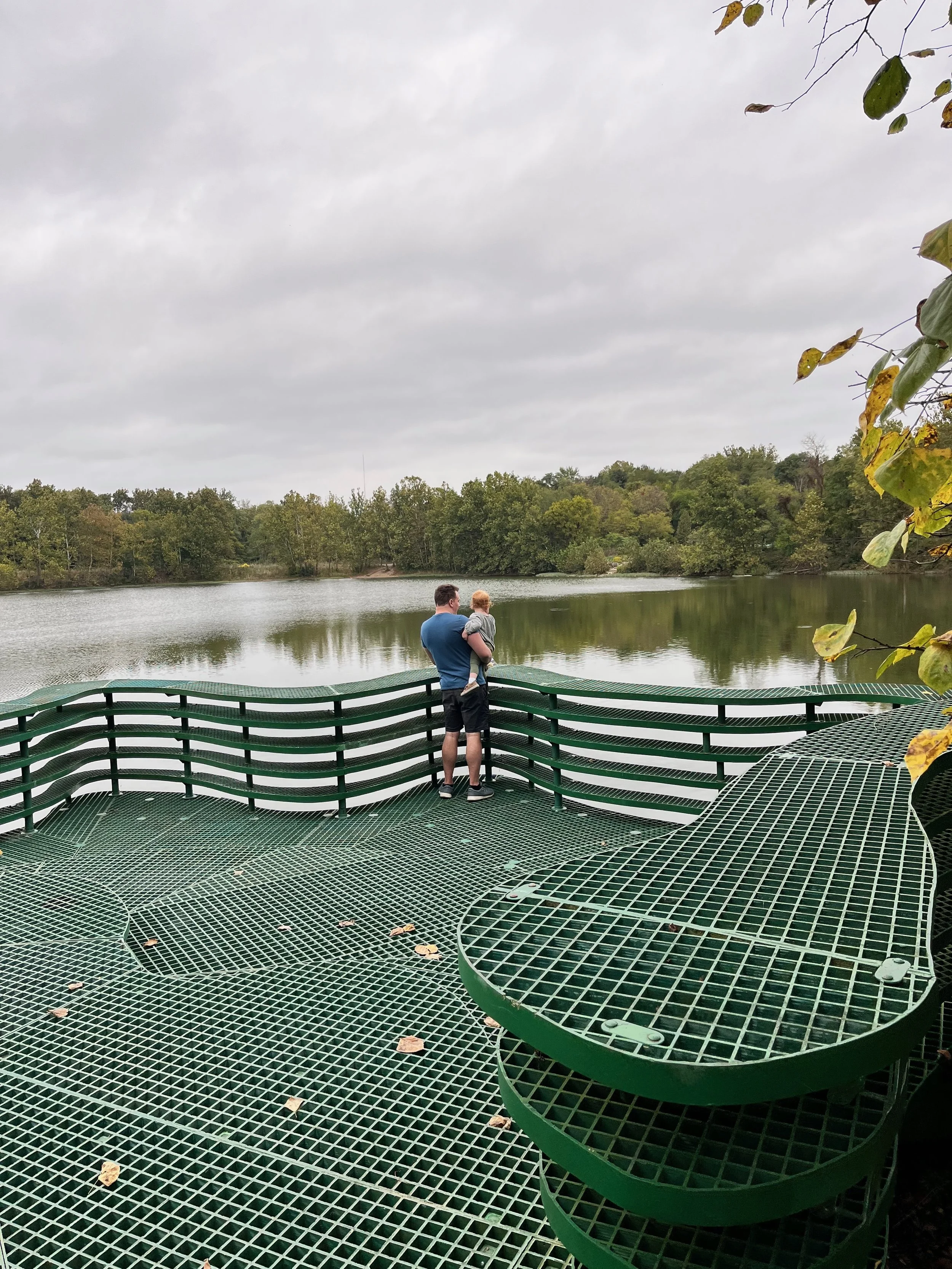 The most popular of the art installations, or at least the only one I knew of before visiting, is Funky Bones. Kids can sit, climb, and jump between the different concrete parks of this skeleton. If you have a good stroller that works on gravel or older kids who can walk moderate distances, I’d recommend walking the 1.4 mile nature trail around the park. The trail is quite wide and takes you past all of the art installations, follows along the lake, and through the woods. It was time for our baby’s nap so we skipped the stroller and I had her in the carrier while my almost 2-year old walked half of the trail and was carried for the other half.