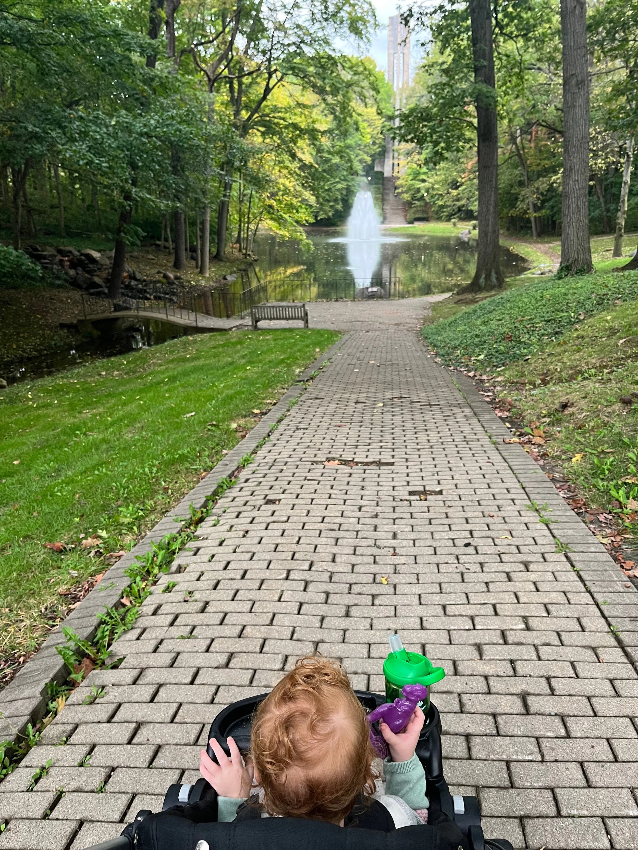 We were staying within walking distance from Butler University and their Holcomb Gardens. After walking through the cute neighborhood streets, stopping at a small playground along the way, we made it to the campus. We started our walk through the gardens at the Holcomb Gardens fountain.