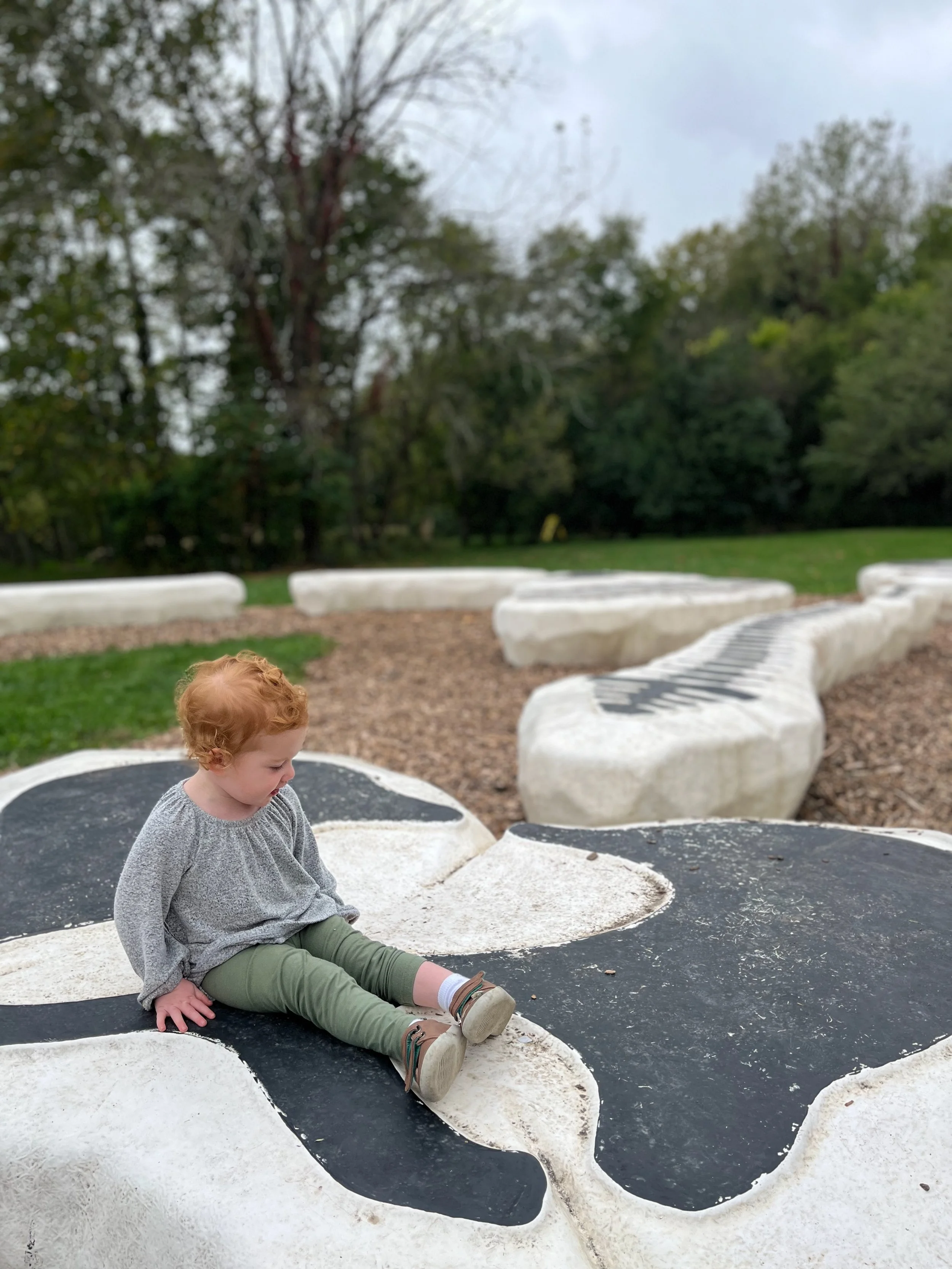 After visiting the art museum, we loaded the kids and the stroller back in the car to drive 2 minutes down the road to Virginia B. Fairbanks Art & Nature Park. This park, while technically part of Newfields, is completely free to visit and is open dawn to dusk. We loved this park and I truly feel like it is a must-see in Indianapolis if you have kids. There is a mix of several large permanent art sculptures and a few temporary ones throughout the huge park. All of them fit well within the nature and are interactive. Art that kids can play on and explore. There are even benches around the main lake that are part of the art.