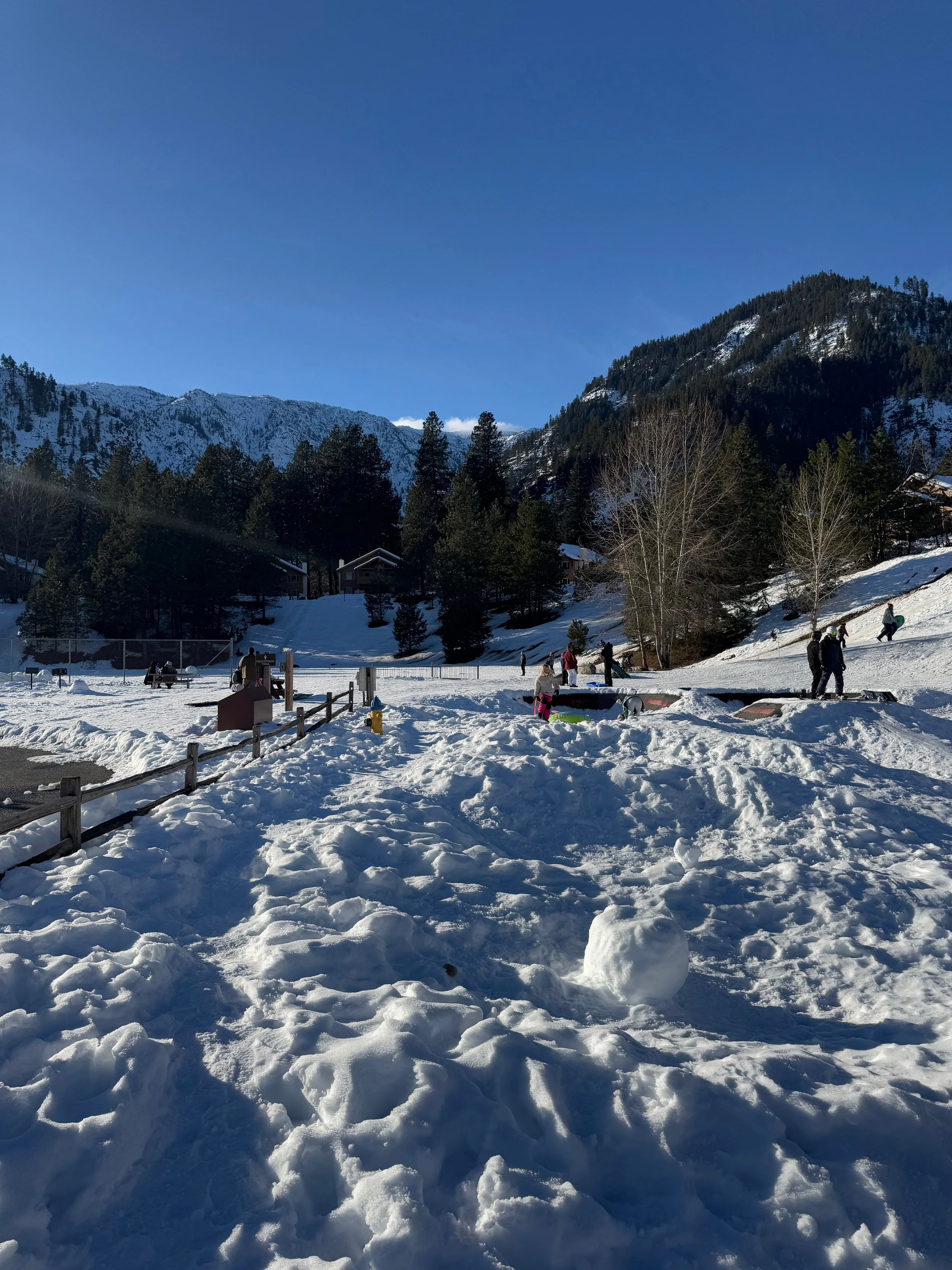 We visited on a weekend and the park was filled, but not overly crowded, with families, both local and visiting, enjoying the park. There were snowboarders and sledders using the steep snowy sides of the pump track. There are large hills surrounding the park that were frequented by sleds and snow tubes. Forts were made out of snow on the field for snow ball fights. Bumps and ramps were made out of snow on the hills to let you catch some air as you sled down them. There were hills of various grades so you can take your pick on how adventurous you wanted to be.