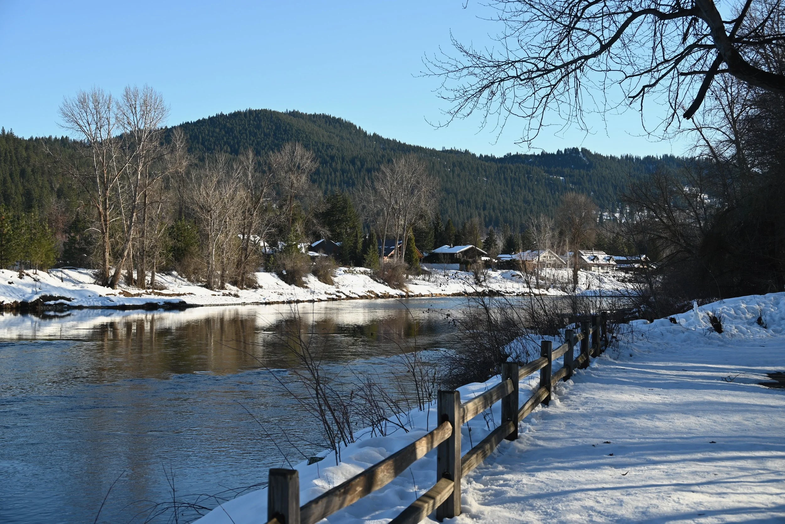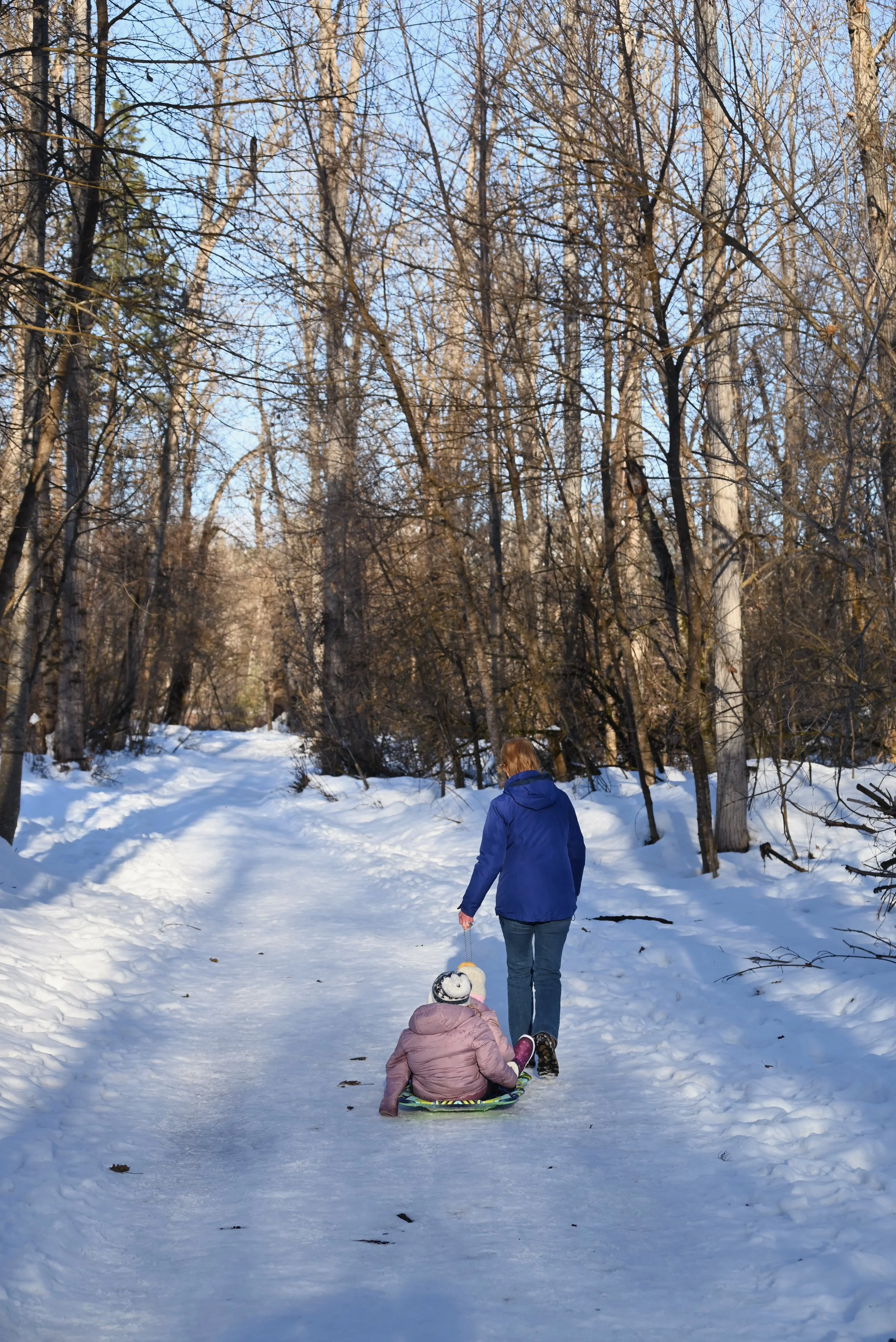 Right from Enchantment Park, there is a short hiking trail that you can take over to Blackbird Island. We loaded the kids on the sled and dragged them behind us as we walked. If you want to do the entire trail loop and end up back at Enchantment Park, it is 1.9 miles. We walked just one way towards waterfront park, through blackbird island, and it ended up being less than a mile. We stopped a lot to take pictures and enjoy the snow and the whole walk took 40 minutes. This is a well-used trail and you will encounter a lot of other people. We did not need snowshoes, just good snow boots, since it is so frequently walked, but we did see a few people using them. If there was just a large snow and you are going to venture out on the trail before everyone else or if the rest of the town is very icy, then snowshoes or microspikes might be more necessary.
