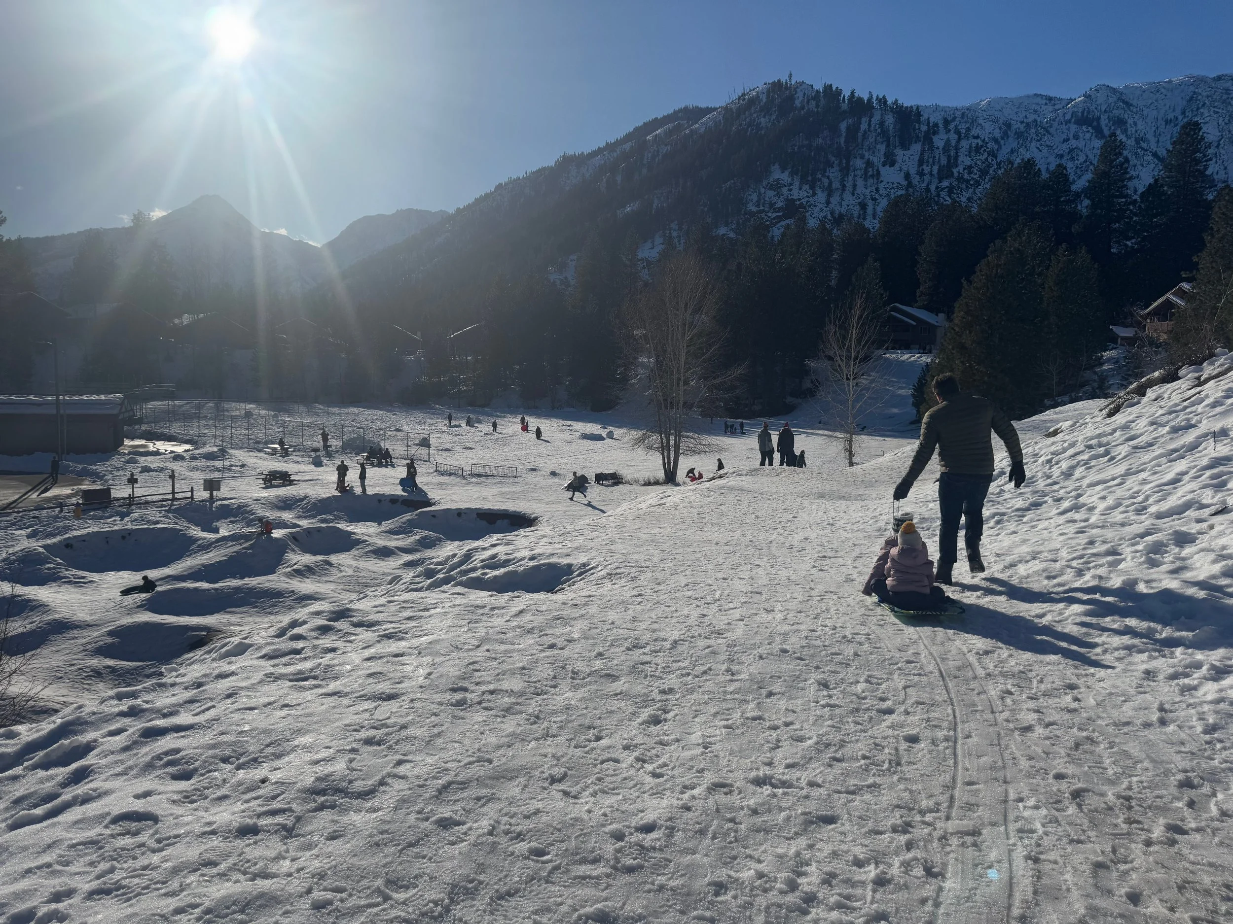 After a lunch break and change of clothes, we walked over to Enchantment Park to go sledding. We brought our sleds from home, but there are plenty of places in town to buy or rent sleds. Bring a backpack with lots of snacks as sledding makes kids far more hungry than I expected. Enchantment Park is close to town and should be an easy walk from your accommodations, even while carrying your sleds. In the summer months, Enchantment park is a large park with baseball fields, a playground, walking trails and a pump track. In the winter, all of those places get covered with snow and turn into a snowball fight fields and the most awesome sledding and snow adventure wonderland. All free.