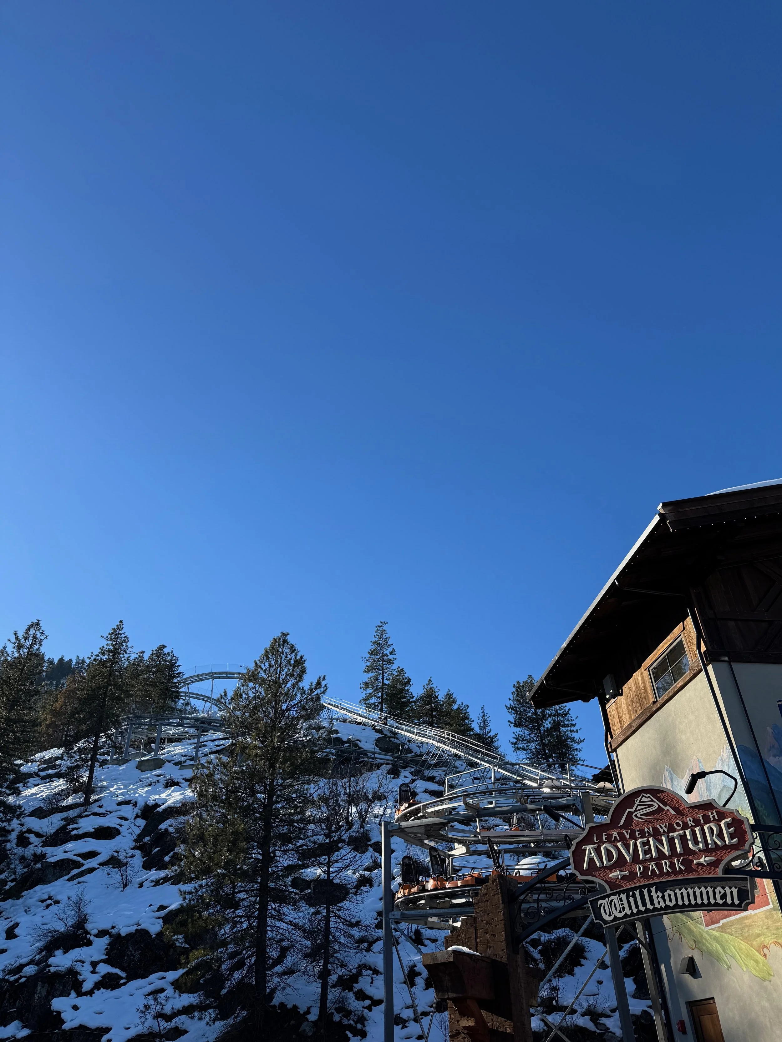 After lunch and a bit of a break in the hotel for the kids, we walked over to the next spot. One of the newer attractions in Leavenworth, is the Leavenworth Adventure Park that is a combination of 3 different attractions. The most notable being the alpine coaster winding on a mountain, that you can spot even from town. Despite being a mountainous state, this is Washington’s first alpine coaster just recently built in 2023. The track is 2,700 feet long and you ride on a self-controlled sled. Kids as young as 3 years old are allowed to ride with an adult. Once kids are at least 54 inches tall, they can ride alone. You can buy tickets for one or two rides and I’d highly recommend the 2 ride option. The first ride gives you a chance to get used to operating the sled and learning the course. The second ride allows you more of an opportunity to enjoy the scenery around you and feel the thrill of the ride.