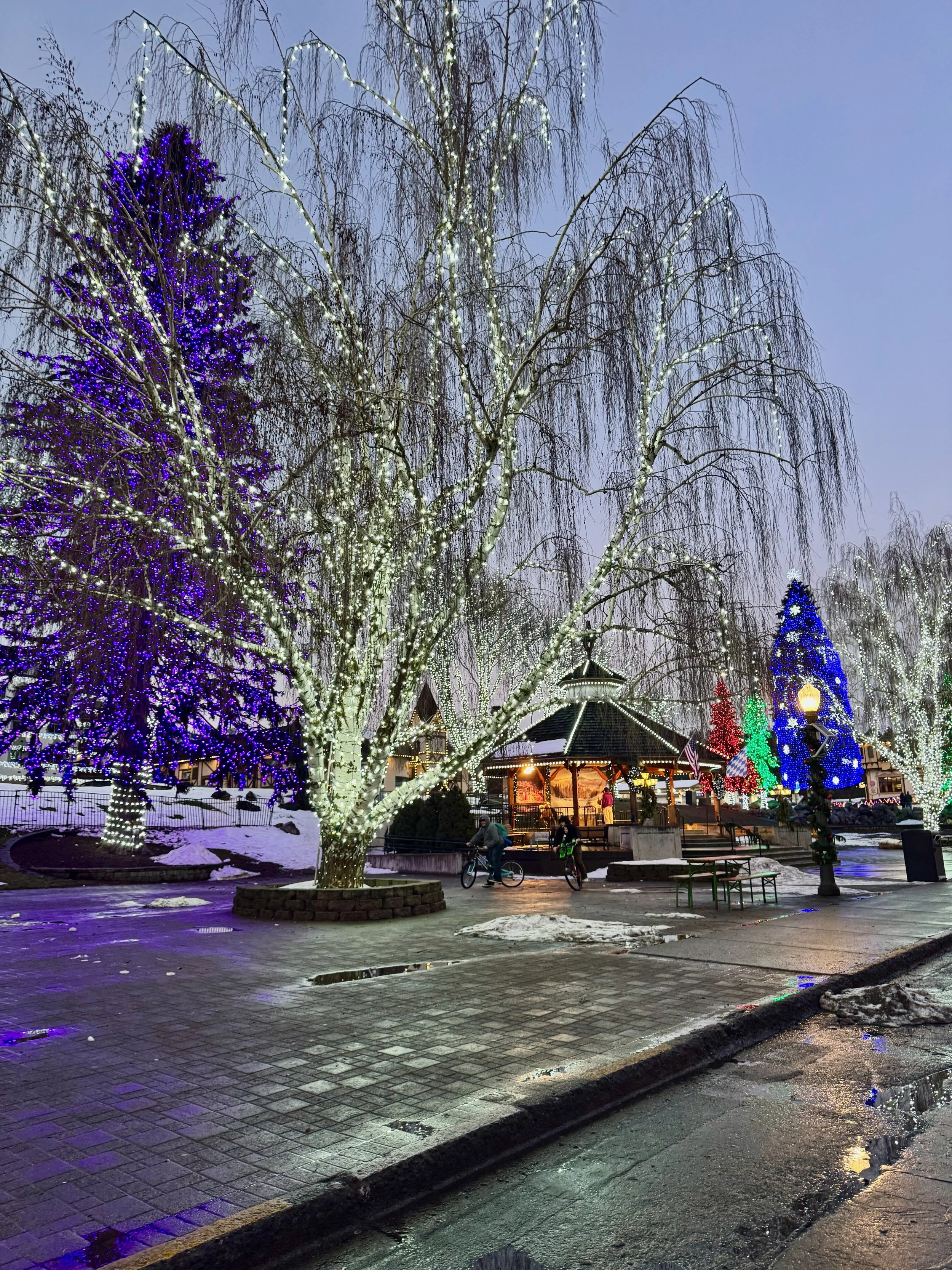 We left Seattle right before noon and got to Leavenworth at 3:30pm, with stops to charge our car, get snacks from Safeway and visit Snoqualmie Falls. Which was perfect timing to check into our hotel, unpack a bit and then walk into town. Our hotel was less than half a mile from Front Street Park and there were well-maintained sidewalks to get there. Depending on the weather, it is still a good idea to have waterproof shoes as there might be puddles from melting snow or it might be actively snowing or recently snowed.