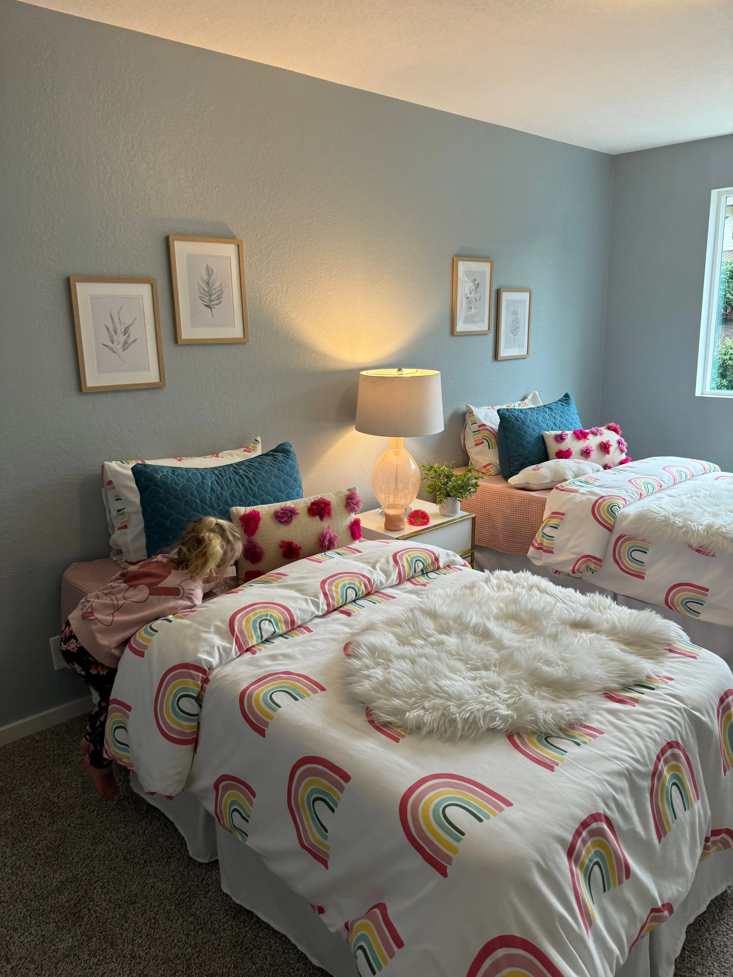 Despite bringing a whole suitcase full of toys, stuffed animals and home comforts for the kids - we ended up going to Target far more frequently than we normally do to buy a toy for each kid. They could have gotten by with what we had, but the mom guilt got the best of me knowing all that they were doing without and that they never asked for the move. I mainly bought "experience"-based toys - craft supplies, science kits, play dough, etc. They also ended up with a couple extra stuffed animals. While we were staying in the rental, we started thinking about their bedrooms in our new house. They shared a room in our old house and we were expecting them to have their own room in our new home. After they picked out the theme or design for the room, we ended up ordering or buying some things for it while we were still in the short-term rental. The plain boring bed sheets that we were provided shortly turned into dinosaur and rainbow comforters. The apartment felt quite sterile but we hung up their artwork and did small changes to make it feel more like home for the month and a half that we stayed there.