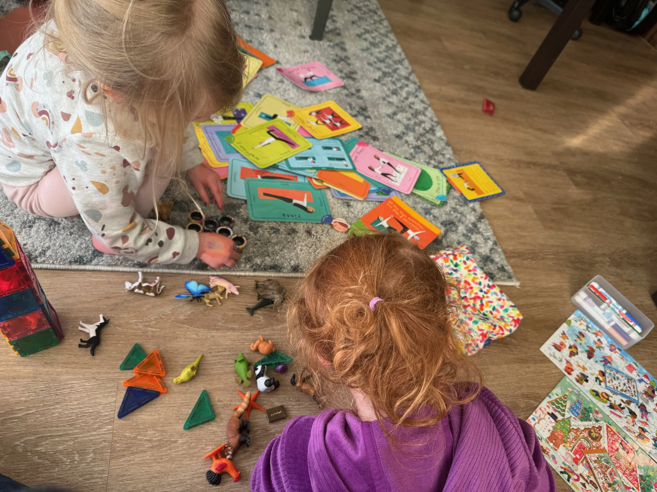 Some of the toys we brought from home in our suitcase for the short-term rental: magnatiles, some animal figurines, compact puzzles, yoga cards.