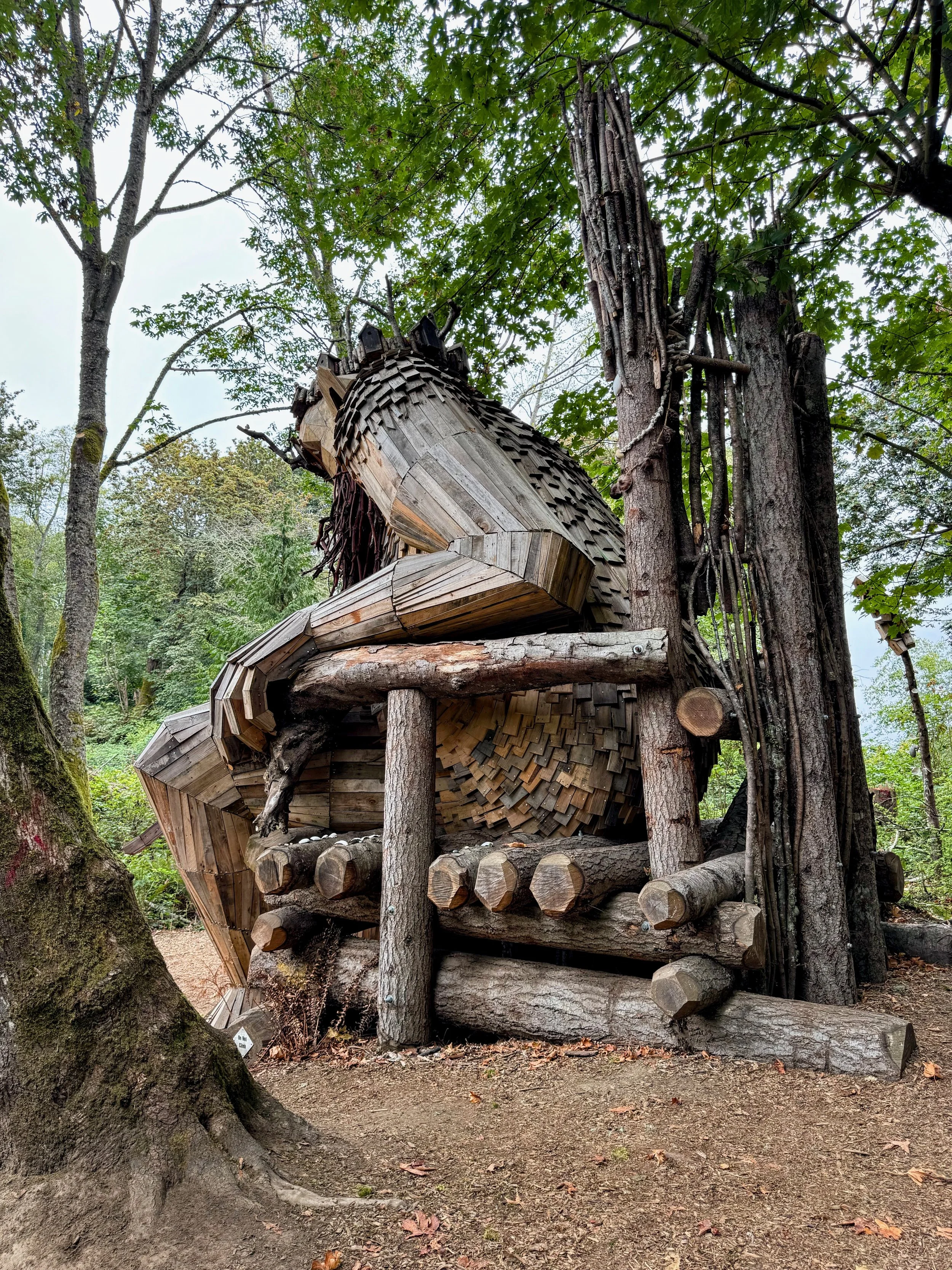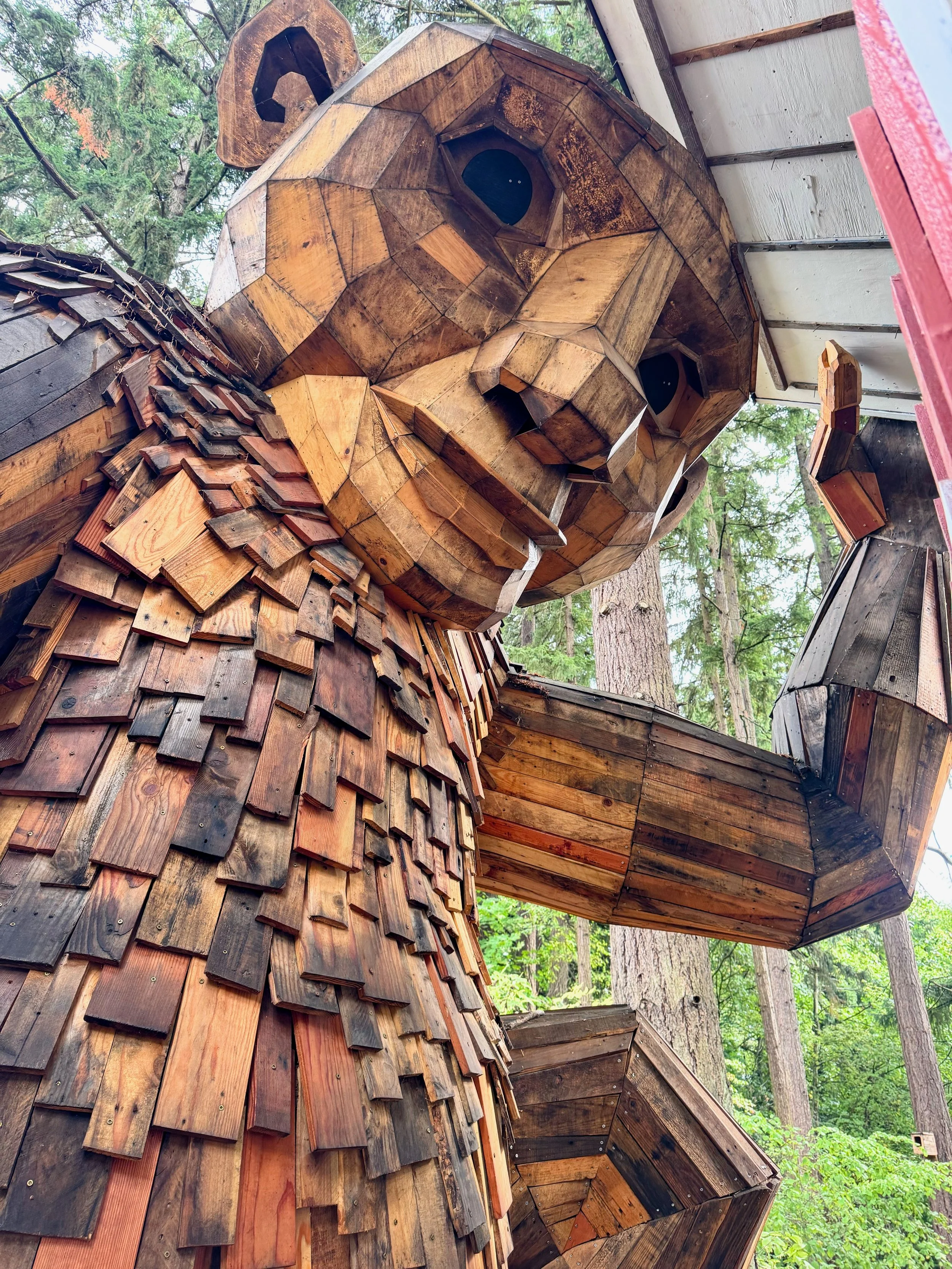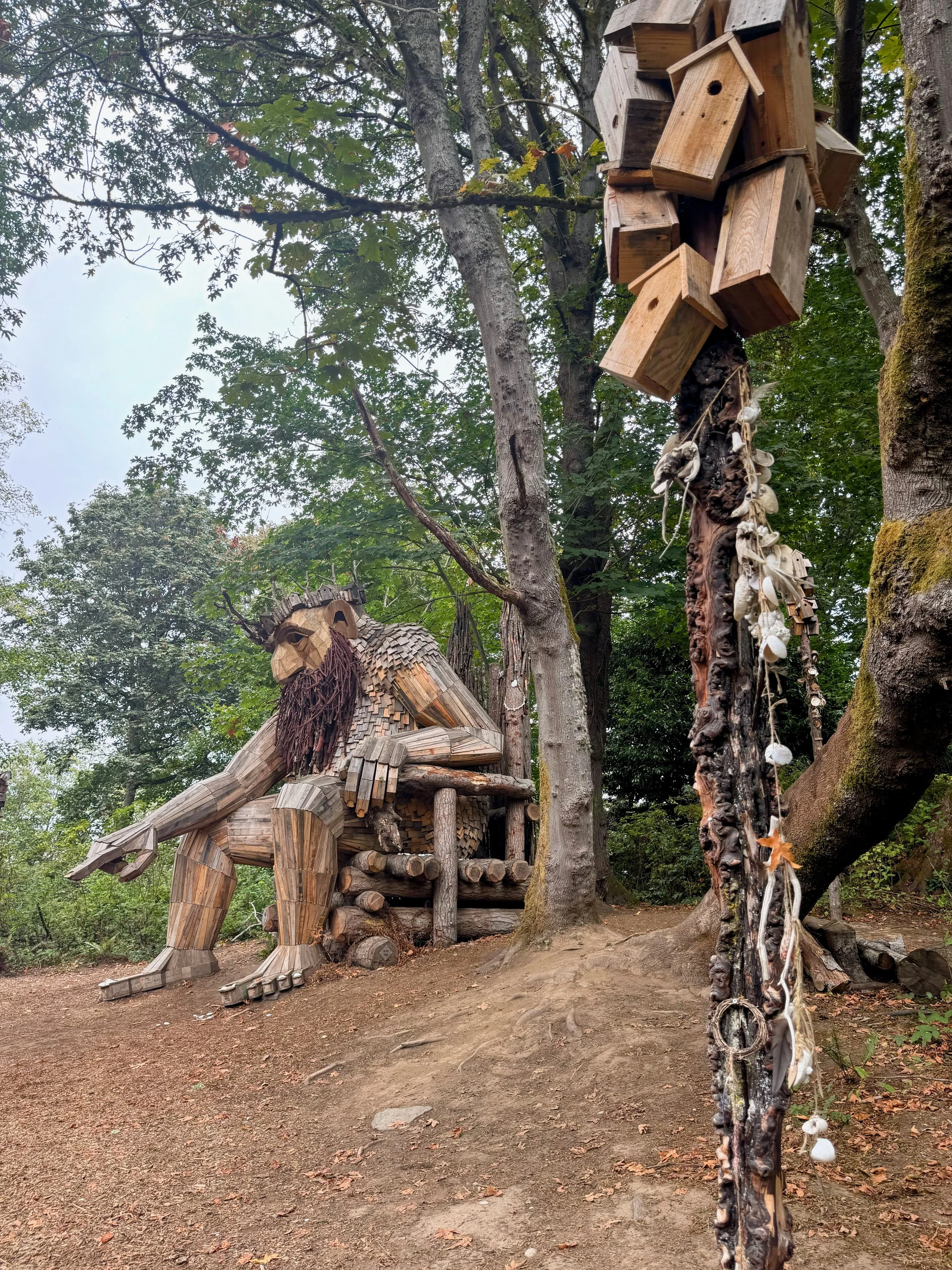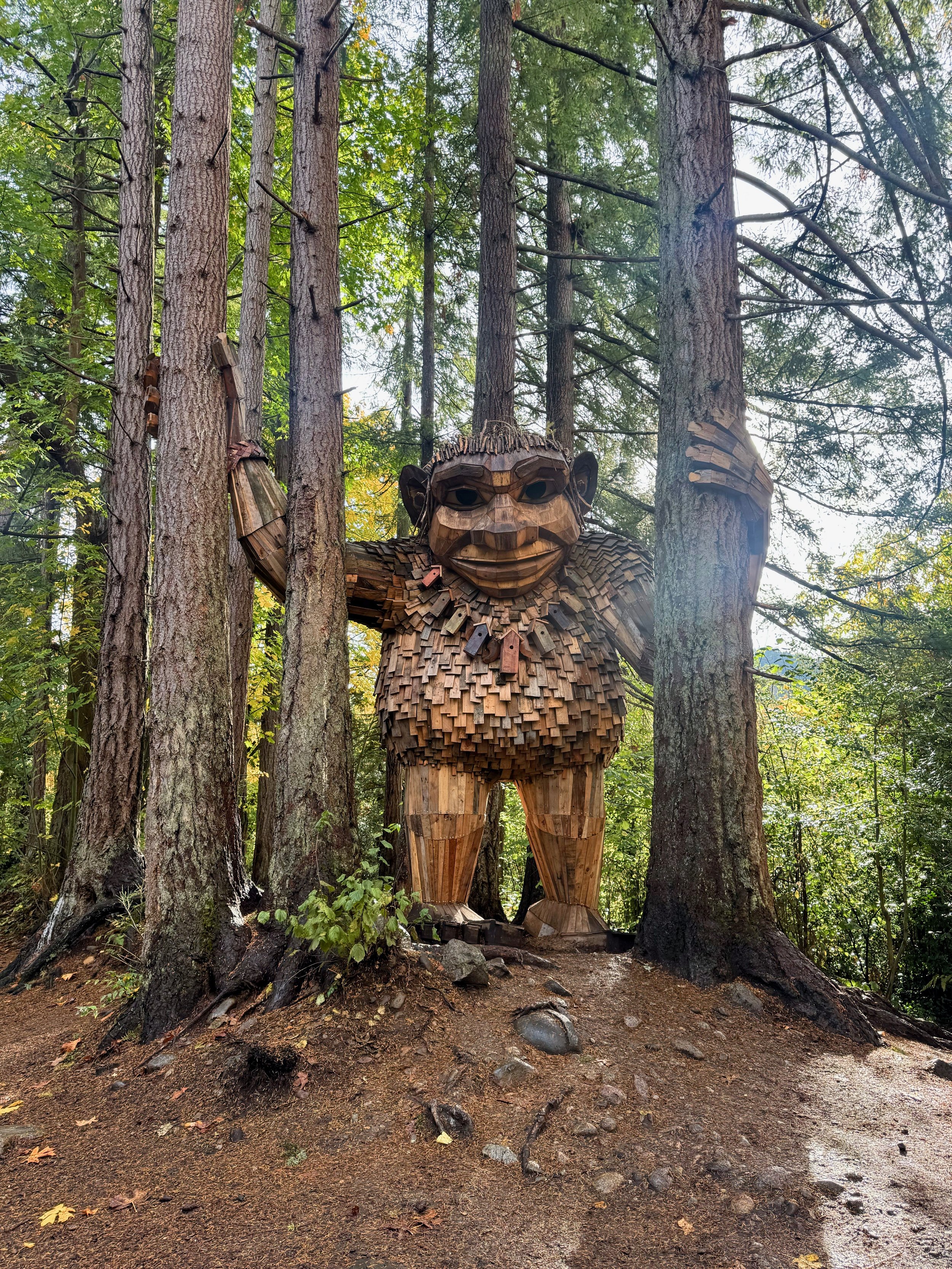 I would be remiss in writing an article about the Pacific Northwest trolls and not include the “original” Fremont Troll. This troll is found in the Fremont neighborhood of Seattle. This troll is obviously quite different from the other 6, but shares their whimsy. The Fremont Troll was created in 1990 by a team of artists to fill this spot beneath the Aurora Bridge that was once a forgotten trash-filled space. It has been a community symbol and a popular attraction since then. This large troll is holding a real VW Beetle in his hands. Unlike the recycled wood of Dambo’s trolls, the Fremont Troll was constructed with rebar and concrete. This sculpture is huge at 18-feet tall. There is a stair case to the side for you to climb up his side and get a view of the troll from many different angles.