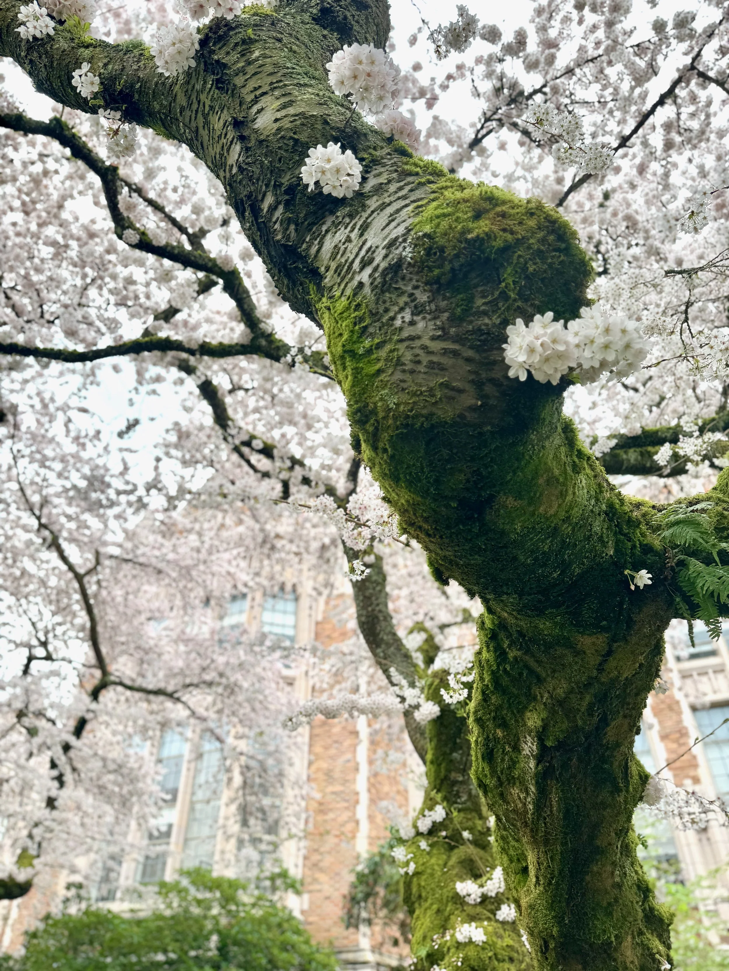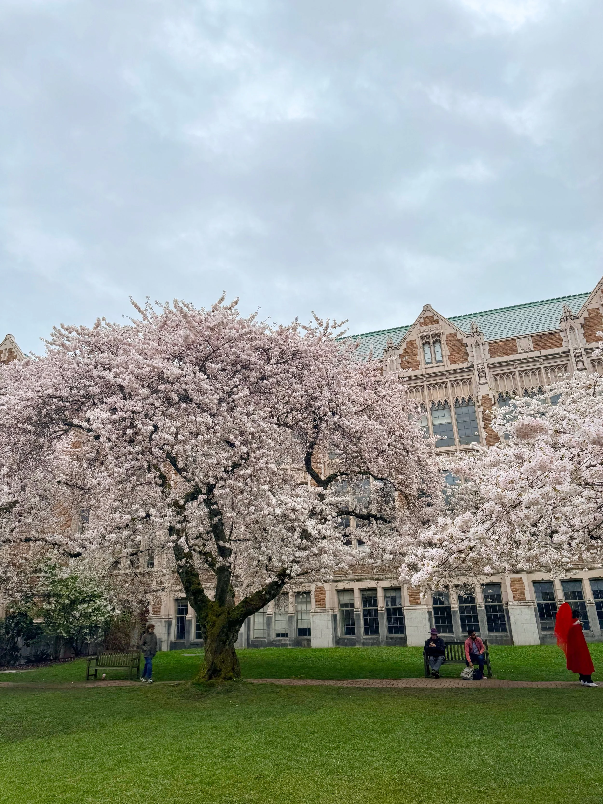 By far the most famous place to enjoy the cherry blossoms in Seattle is the University of Washington’s Quad. As of 2026, the Quad has 29 large Yoshino cherry trees that are about 90 years old. One of my favorite ways to know when these gorgeous trees start blooming is following the instagram account “uwcherryblossom” – they start giving regular updates about a week before the first blooms until all of the pedals fall. You can also look at the live web cams of the Quad and Cherry blossoms to see what the trees are looking like and how crowded it is. The exact bloom dates change year to year, but in the last few years, bloom typically takes place between March 12th and April 3rd. The blooms stay for just 2-3 weeks.