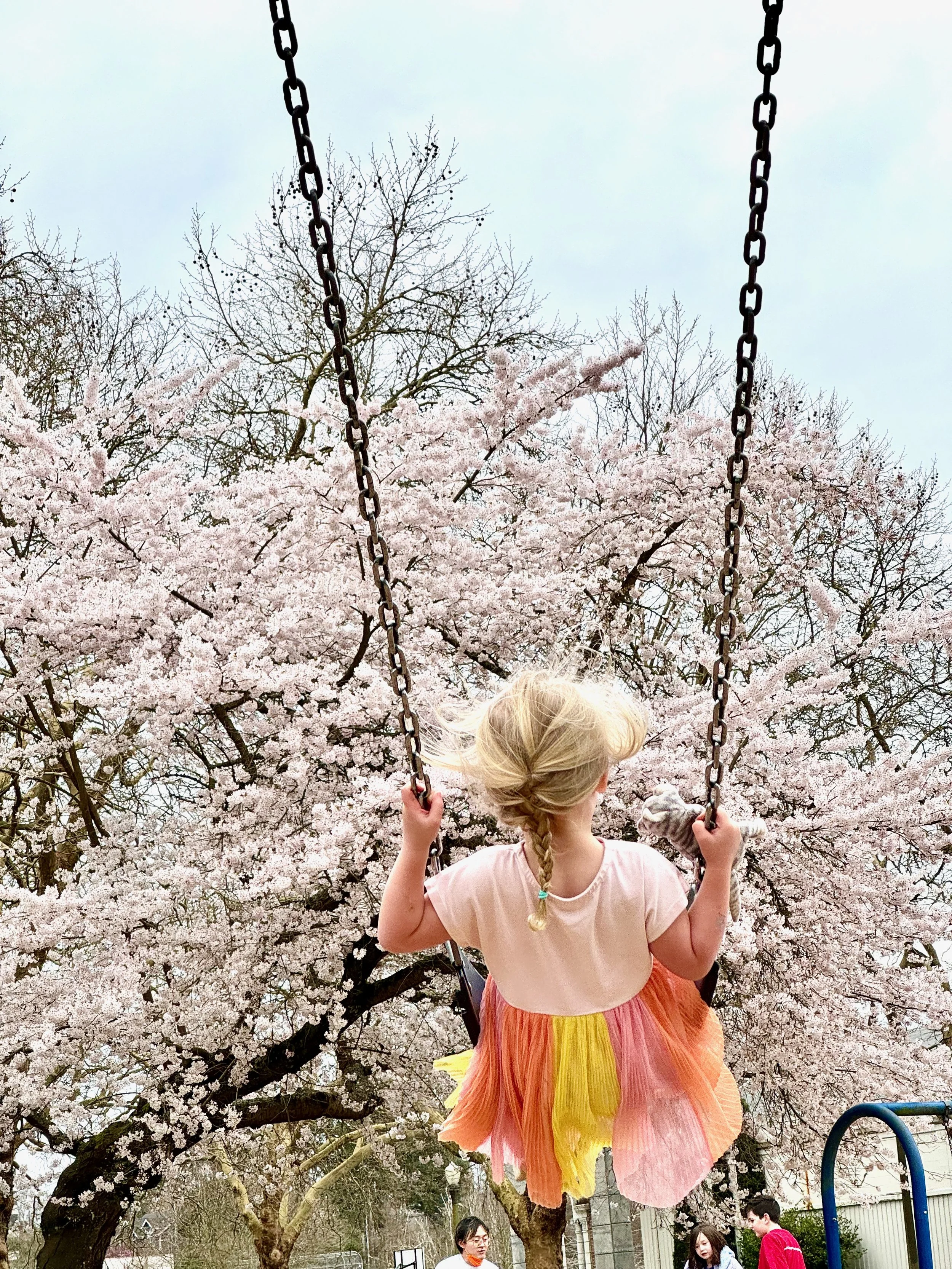 To find the cherry blossoms and other signs of spring at Green Lake, you can walk the 2.8 mile loop around the lake or just hang out around the playground. The playground, which is on the side of the lake near the boathouse, is surrounded by beautiful blooming trees.