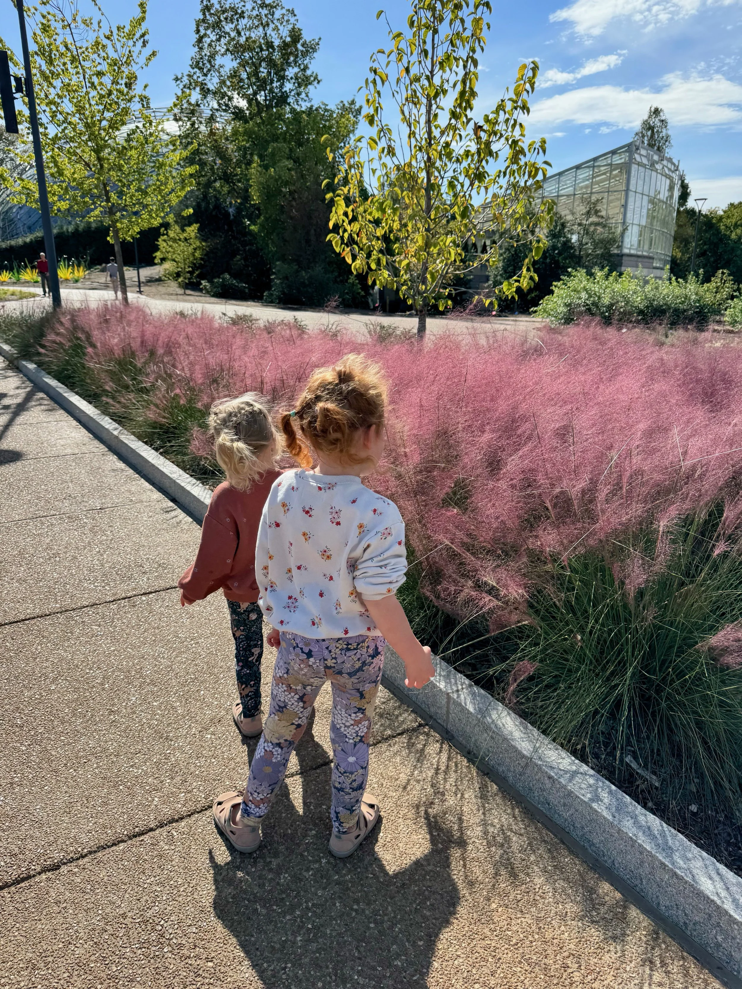 Do not ignore the prairie area of the park as there are often still late flowering shrubs and native grasses glowing gold and rust. The water features are turned off at the beginning of October, but you can still walk through the dry creek bed.